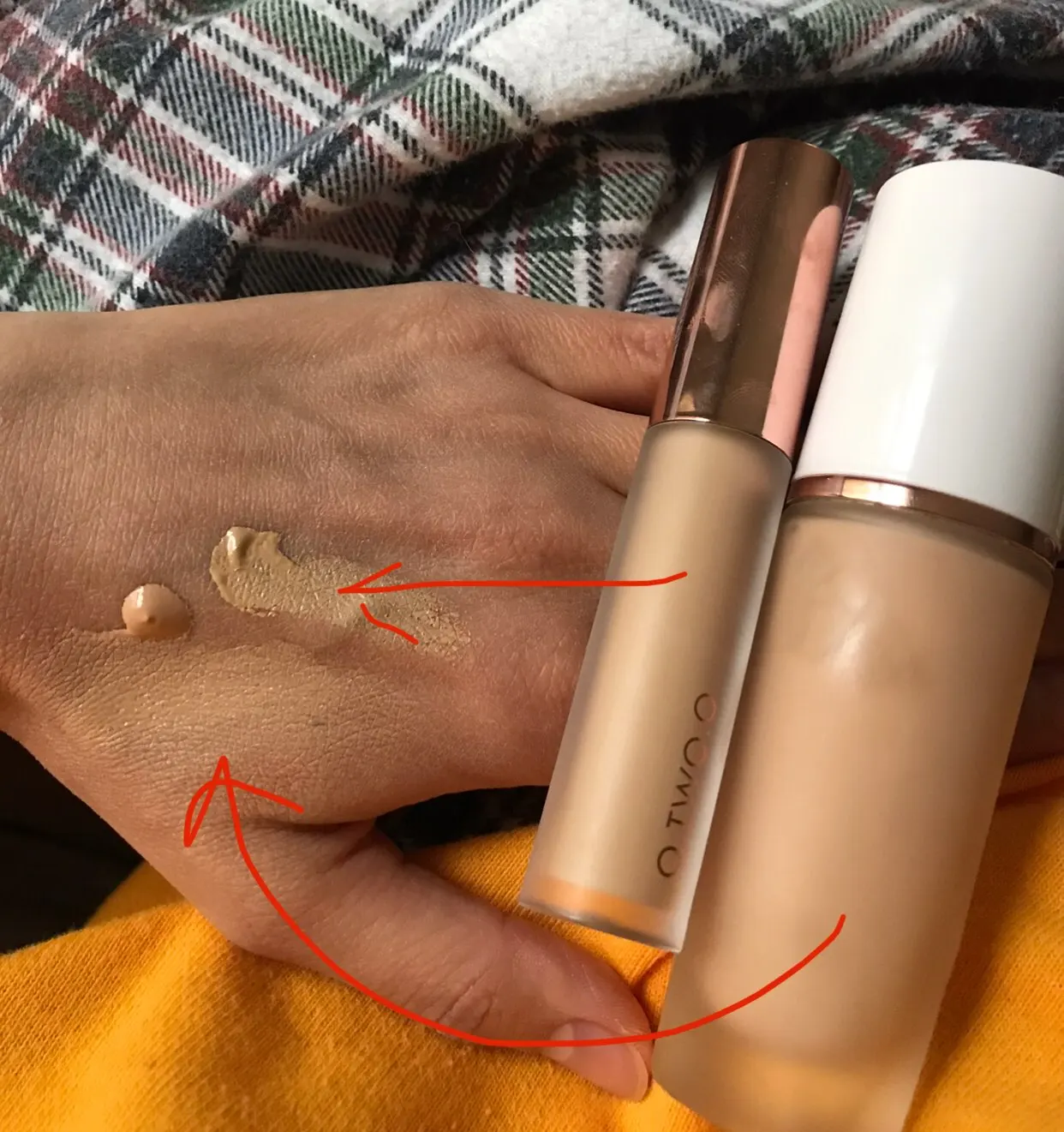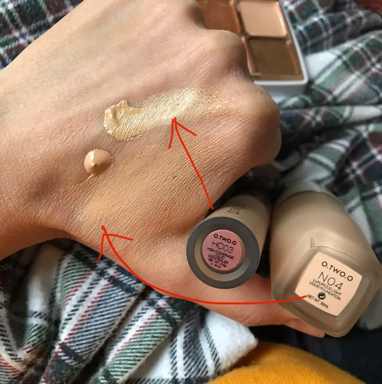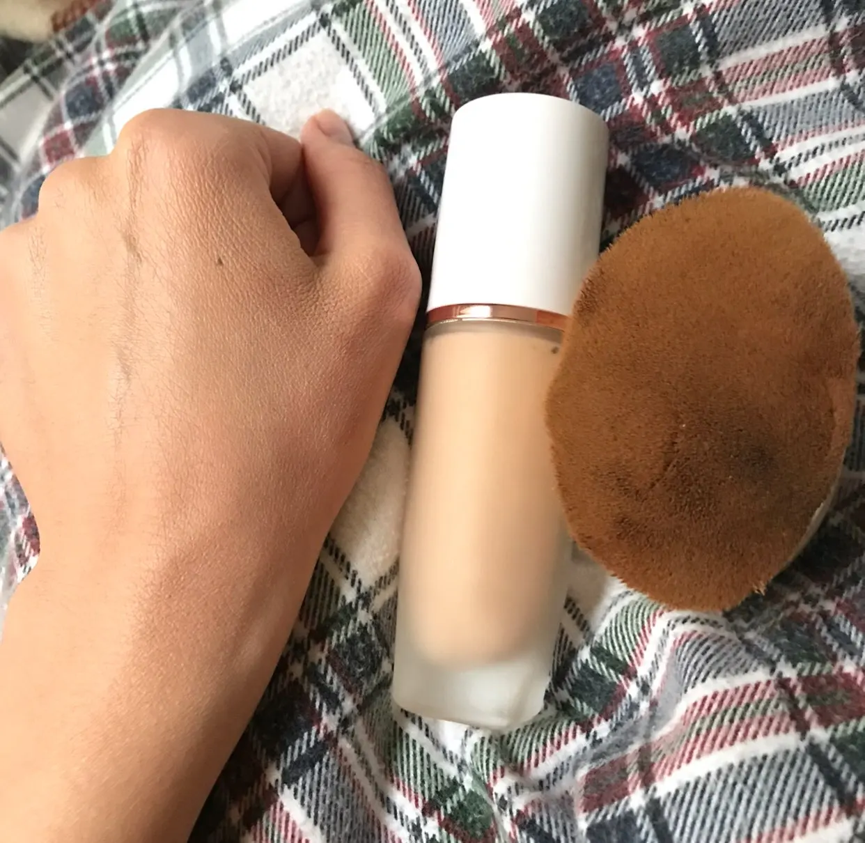 Color (number 4) in life-beige without yellowness. On the photo in comparison with the concealer number 3, and he has yellowness is viewed. (My photos, it seems to me, convey pretty real colors). Wonderfully lies down, spread with a thin layer (I applied a brush-it's in the photo), on the face feels nice, does not stick. Peeling highlights. Smell some floral, thin, in 15 minutes it is not heard already (for me it is important, I do not like to smell cosmetics for a long time). The lid does not fit very tightly, it Shats (this, maybe, only I have it). But the pump works well, you can squeeze out and the Pea. Bottle glass, matte, to the touch pleasant.